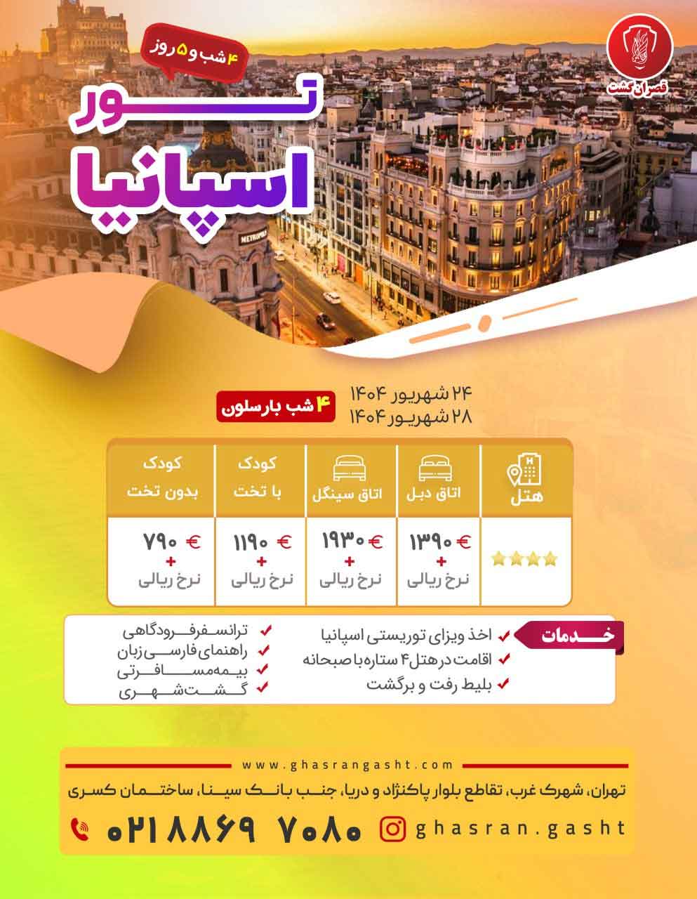 قصران گشت با سال ها تجربه در زمینه اخذ ویزای شینگن و همچنین برگزاری تور اروپا در خدمت شما عزیزان است. چنانچه قصد سفر به کشور اسپانیا را دارید جهت هرگونه مشاوره در خصوص دریافت ویزای شینگن با شماره 02188697080 تماس حاصل فرمایید تا از مشاوره رایگان کارشناسان مجرب ما برخوردار شوید.