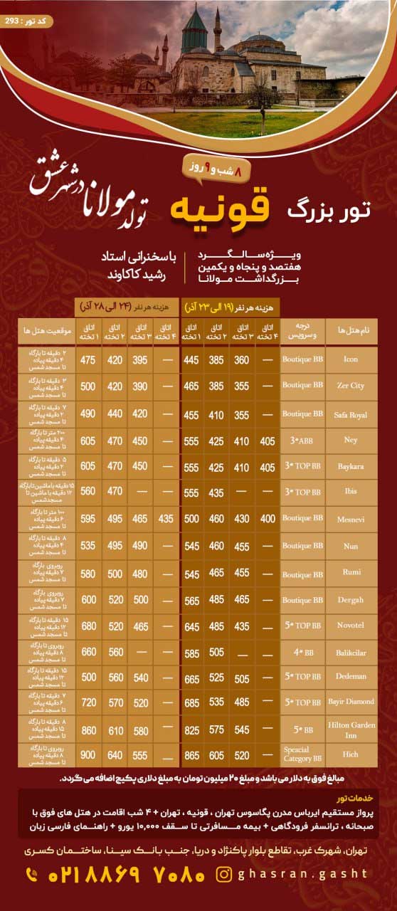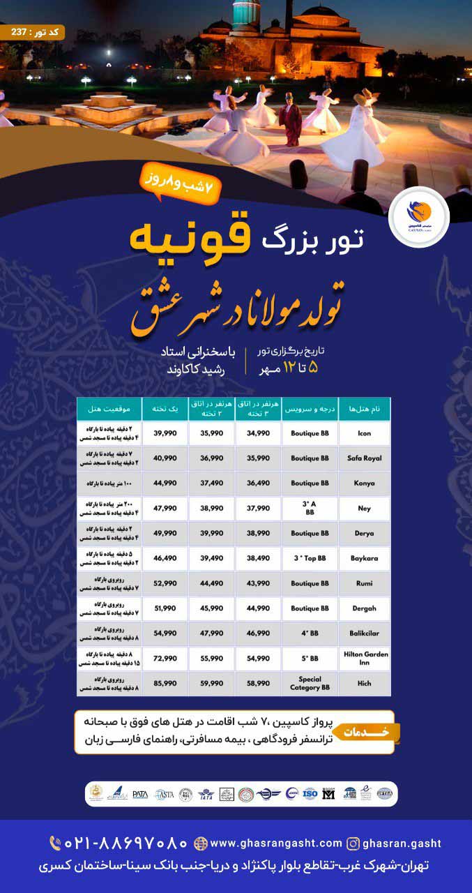 برای سفر به قونیه میتوانید از خدمات تورهای ترکیه و تور قونیه بهره ببرید و سفری به یادماندنی داشته باشید.