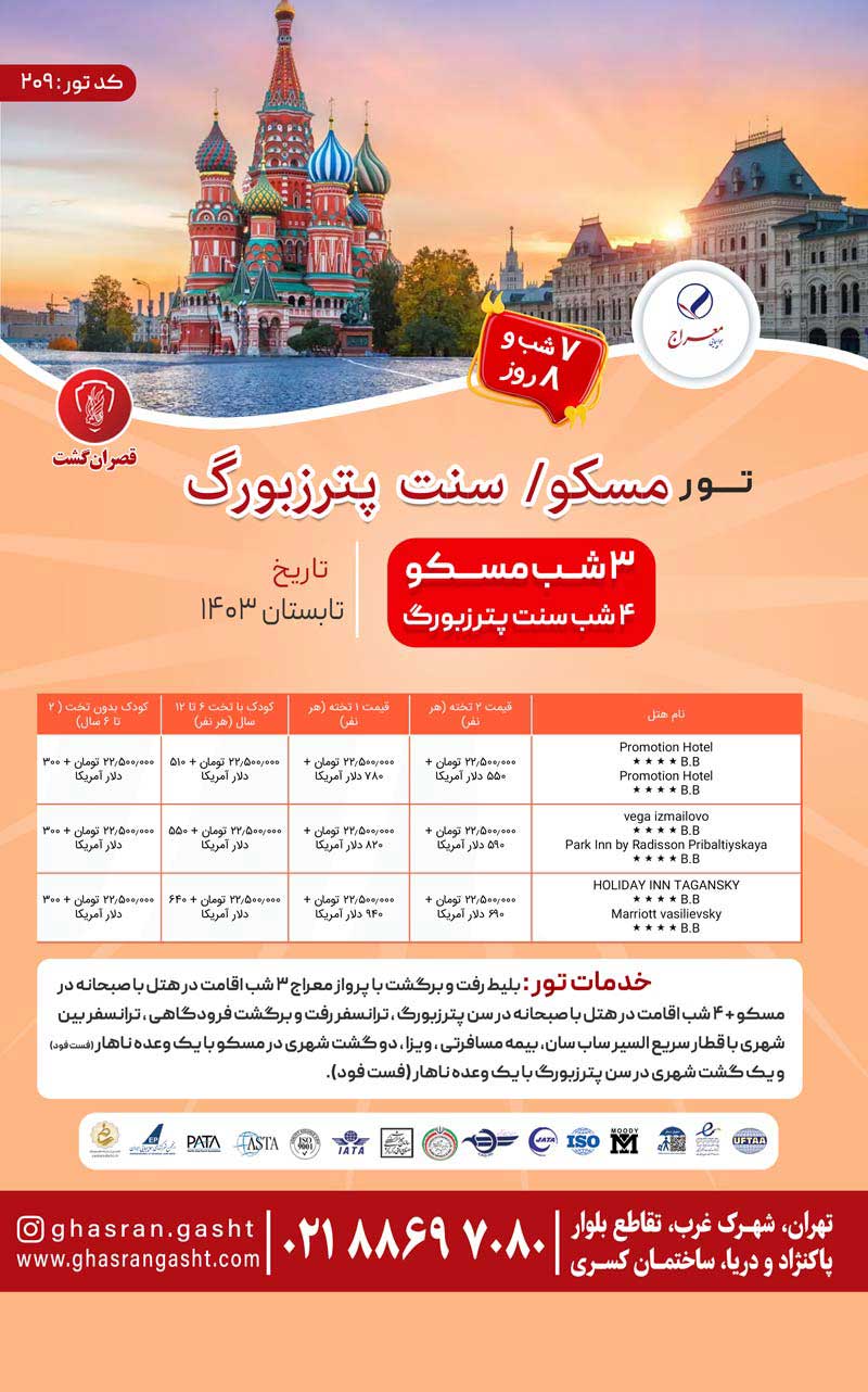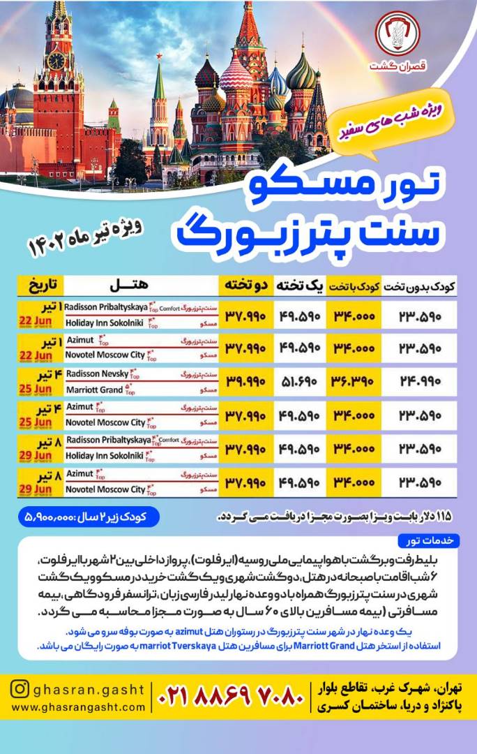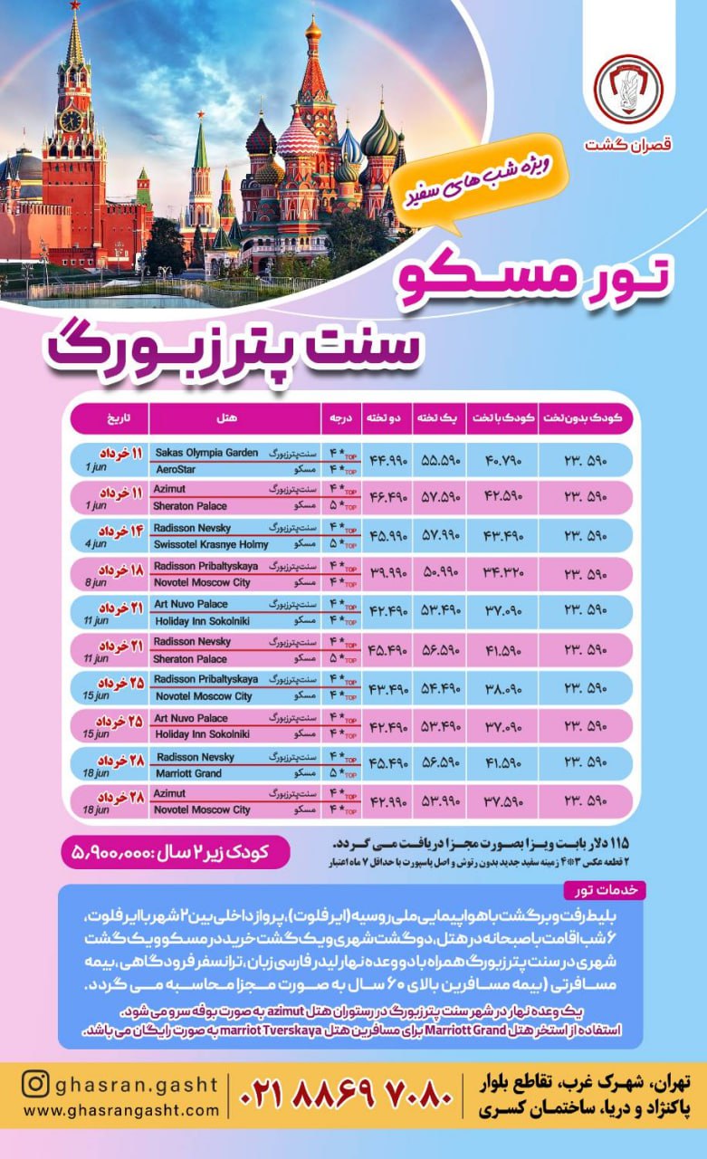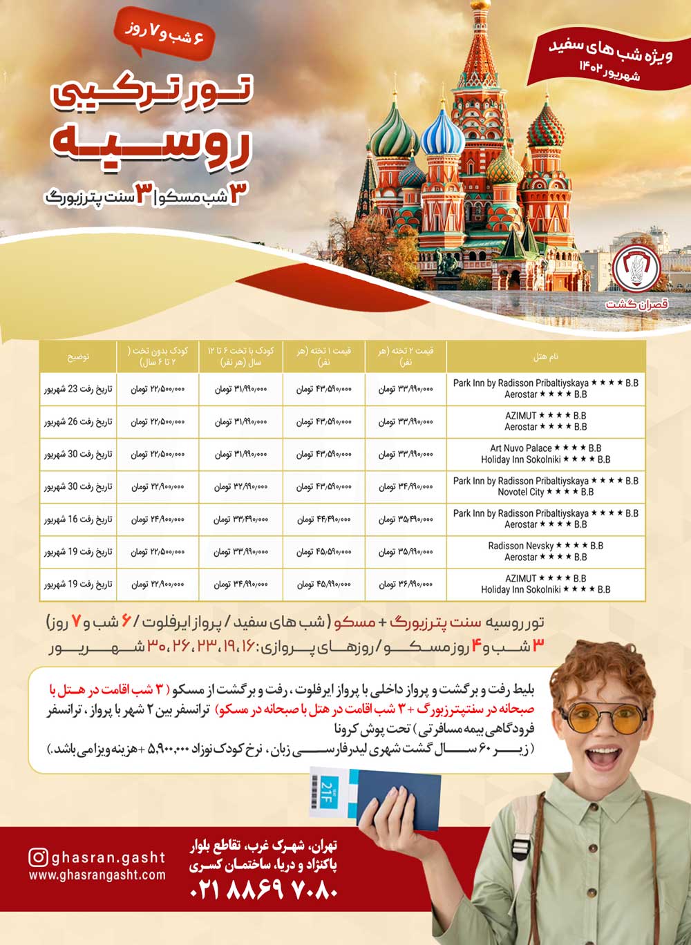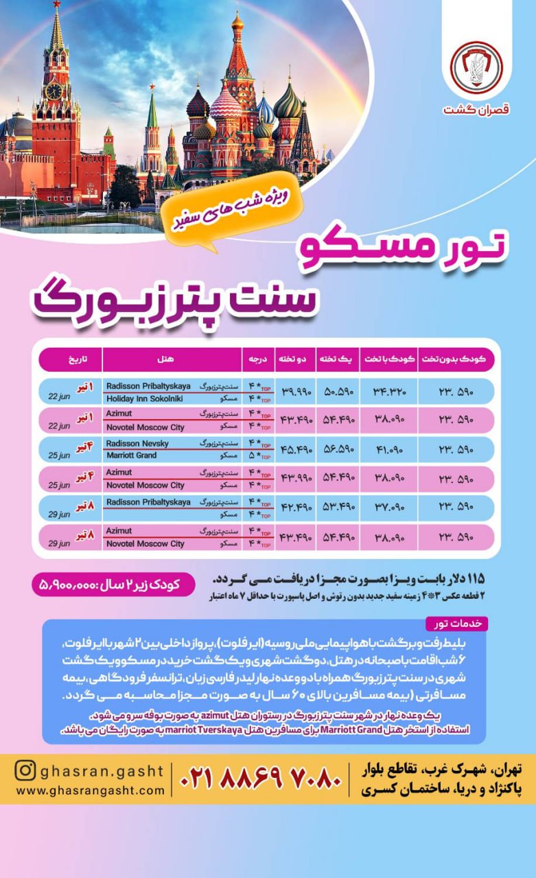 قصران گشت با سال ها تجربه در زمینه اخذ ویزا و همچنین برگزاری تور در خدمت شما عزیزان است. چنانچه قصد سفر به کشور روسیه و استفاده از تور روسیه را دارید جهت هرگونه مشاوره با شماره 02188697080 تماس حاصل فرمایید تا از مشاوره رایگان کارشناسان مجرب ما برخوردار شوید.