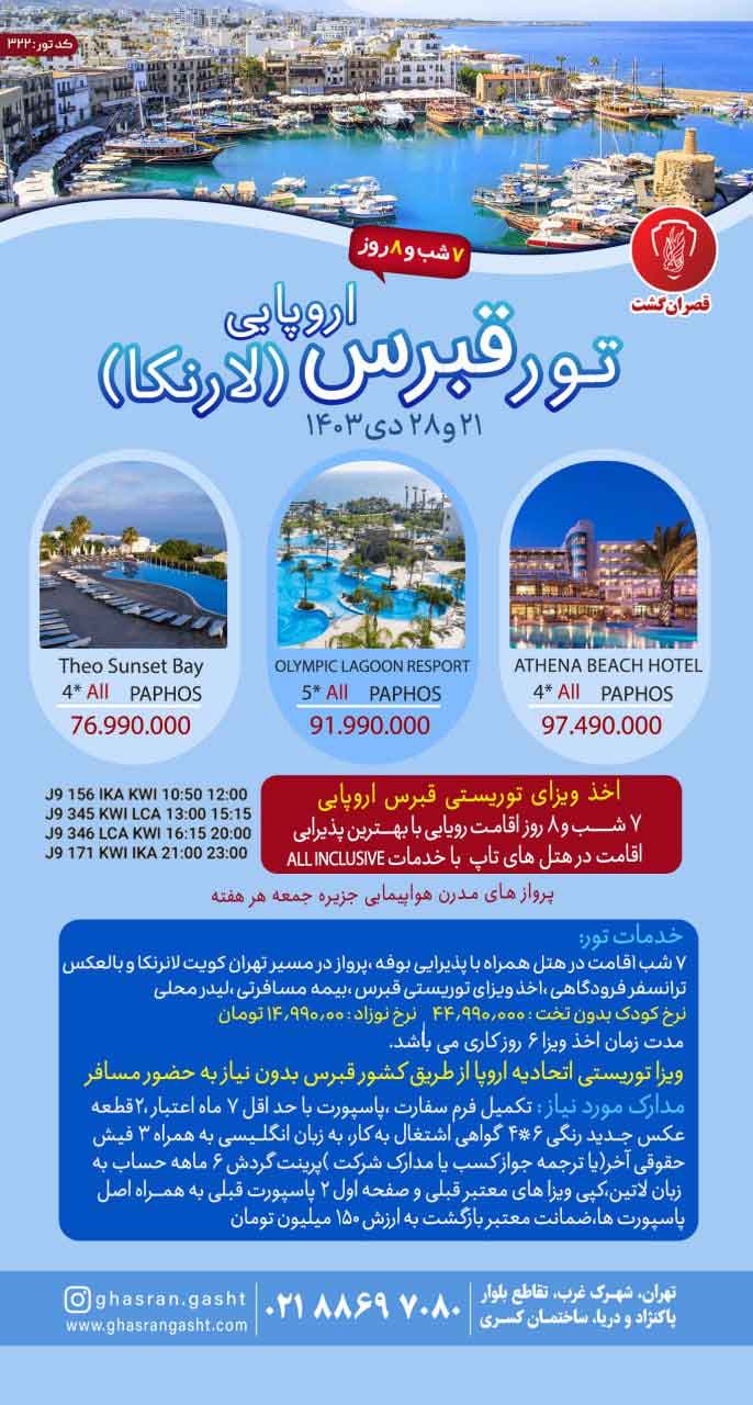 جزیره قبرس در شرق مدیترانه واقع شده است و مساحتی حدود 9251 کیلومتر دارد و در نقطه‌ای میان سه قاره آسیا، آفریقا و اروپا قرار گرفته است. سواحل این جزیره حدود 1364 کیلومتر است و انواع  میوه ها و سبزیجات دراین مناطق یافت می شود.
