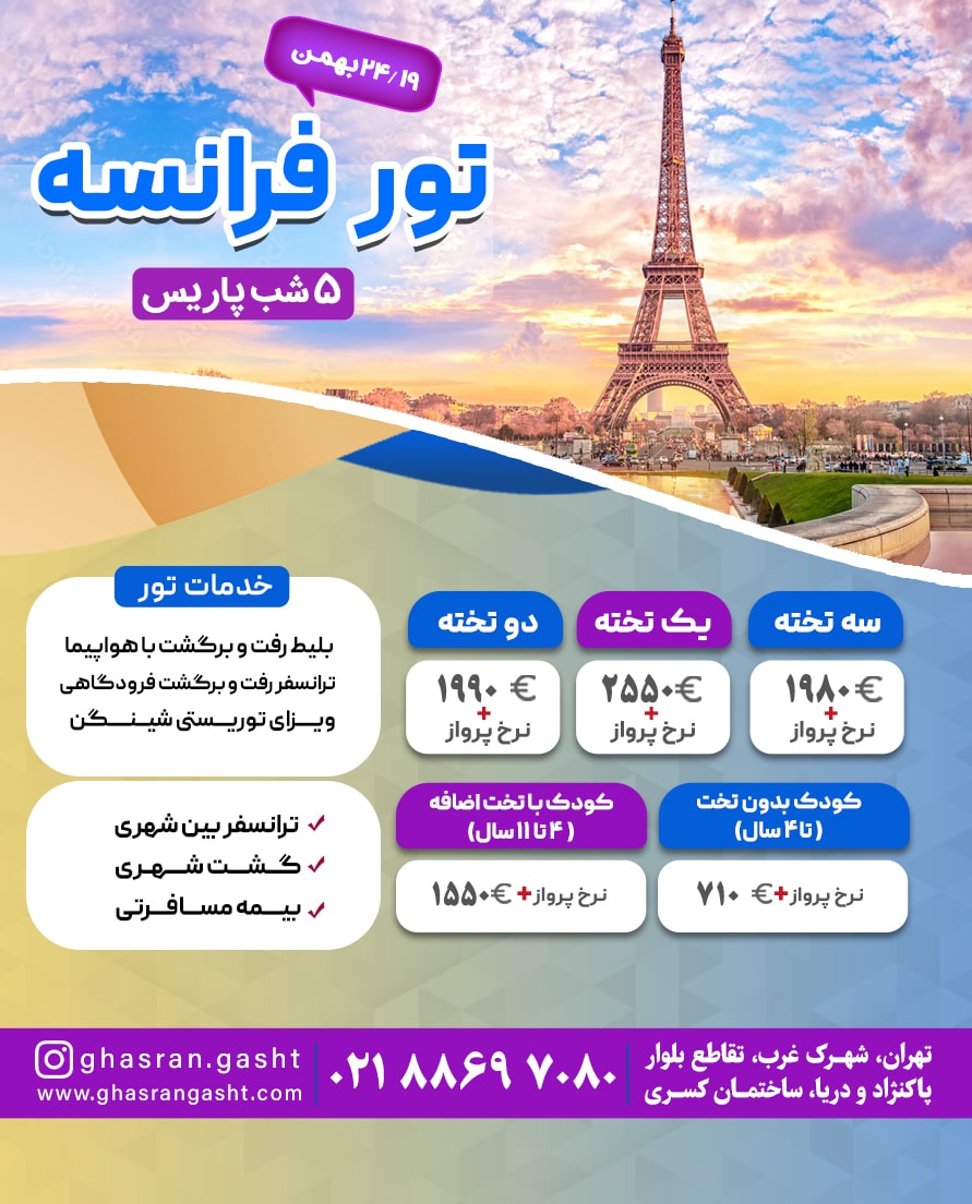 بنابراین به شما پیشنهاد می کنیم برای سفر به این کشور از تور مسافربری با کیفیت فرانسه در قصران گشت استفاده کنید تا بتوانید حداکثر استفاده از سفر خود را با به صرفه ترین هزینه را داشته باشید.