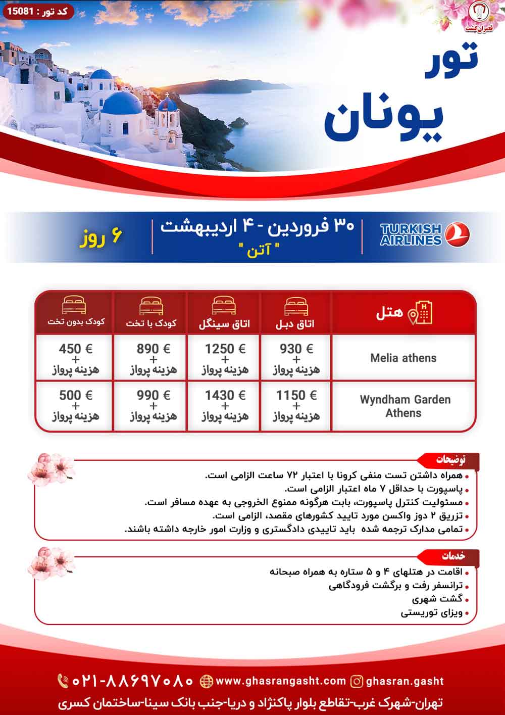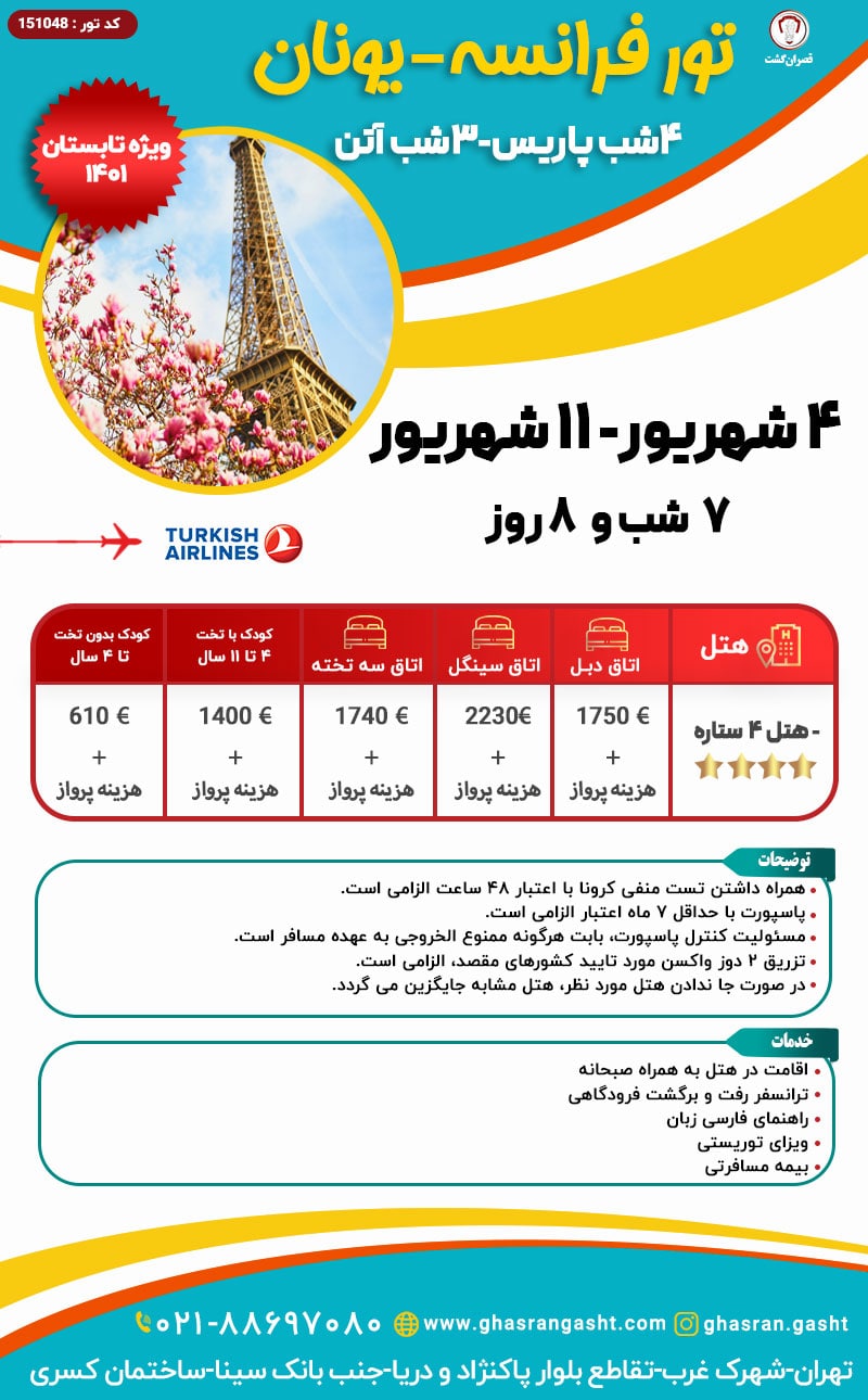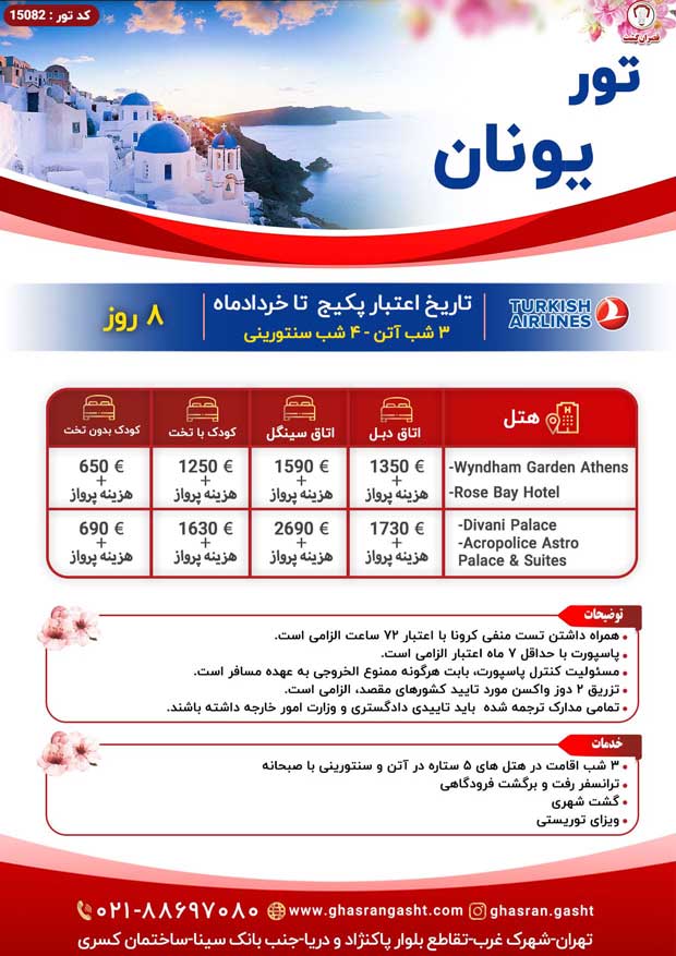 کشور یونان در جنوب و جنوب شرقی اروپا با جمعیتی حدود 11 میلیون نفر واقع شده است. آتن یکی از بزرگ ترین شهرها بعد از تسالونیکی و همچنین پایتخت این کشور است. این کشور گهواره تمدن غربی به حساب می آید که جایگاه محکمی در دموکراسی، فلسفه غرب، ادبیات غربی، تاریخ نگاری، علوم سیاسی و … دارد. یونان علاوه بر ویژگی های خاص فرهنگی و متمدن، از جاذبه های گردشگری و مناظر طبیعی منحصر به فردی نیز برخوردار است. در واقع صنعت گردشگری یونان جزو میراث فرهنگی منحصر به فرد این کشور می باشد. آژانس مسافرتی قصران گشت با ارائه خدمات با کیفیت و مقرون به صرفه برای شما و عزیزانتان سفری رویایی را رقم می زند. با استفاده از این خدمات، سفری به یادماندنی را به همراه خانواده و یا دوستان خود تجربه کنید.