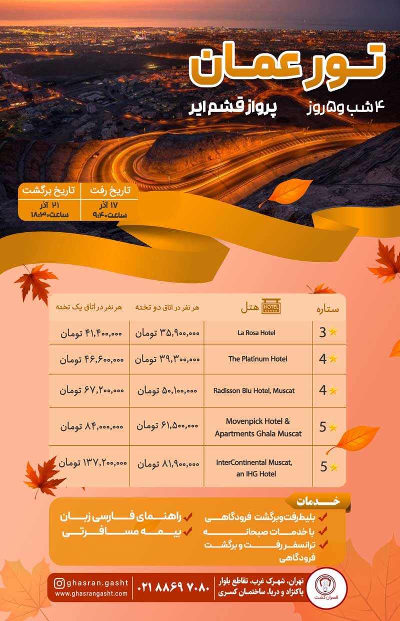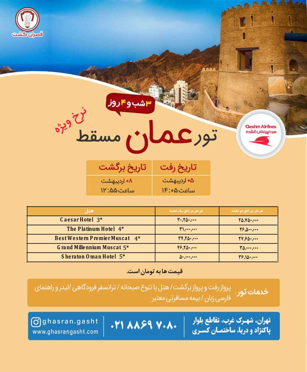 عمان یکی از کشورهایی است که سفر به آن به خصوص در 6 ماه دوم سال خالی از لطف نیست. برای سفر به این کشور آسیایی پیشنهاد می کنیم از خدمات تور عمان قصران گشت استفاده نمایید.