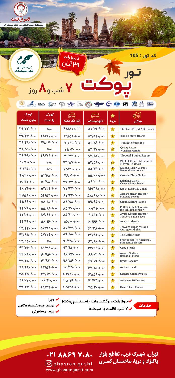 اطلاعات کلی مدارک ویزا مدارک مورد نیاز برای ویزای تایلند: اصل پاسپورت با حداقل 7 ماه اعتبار. گردش حساب بانکی با حداقل 7 میلیون تومان. ۲ قطعه عکس رنگی ۴ × ۳ تمام رخ با پشت زمینه سفید. کپی شناسنامه. کپی کارت ملی. اطلاعات تایلند پایتخت : بانکوکواحد پول : بات (THB)زبان رسمی : تایلندیشهرهای مهم : بانکوک، پوکت، پاتایا اشتراک گذاری در شبکه های اجتماعی