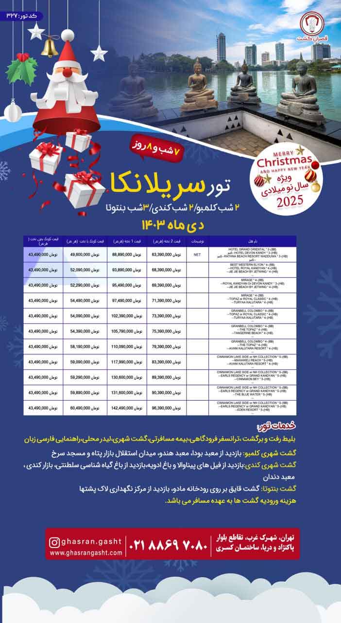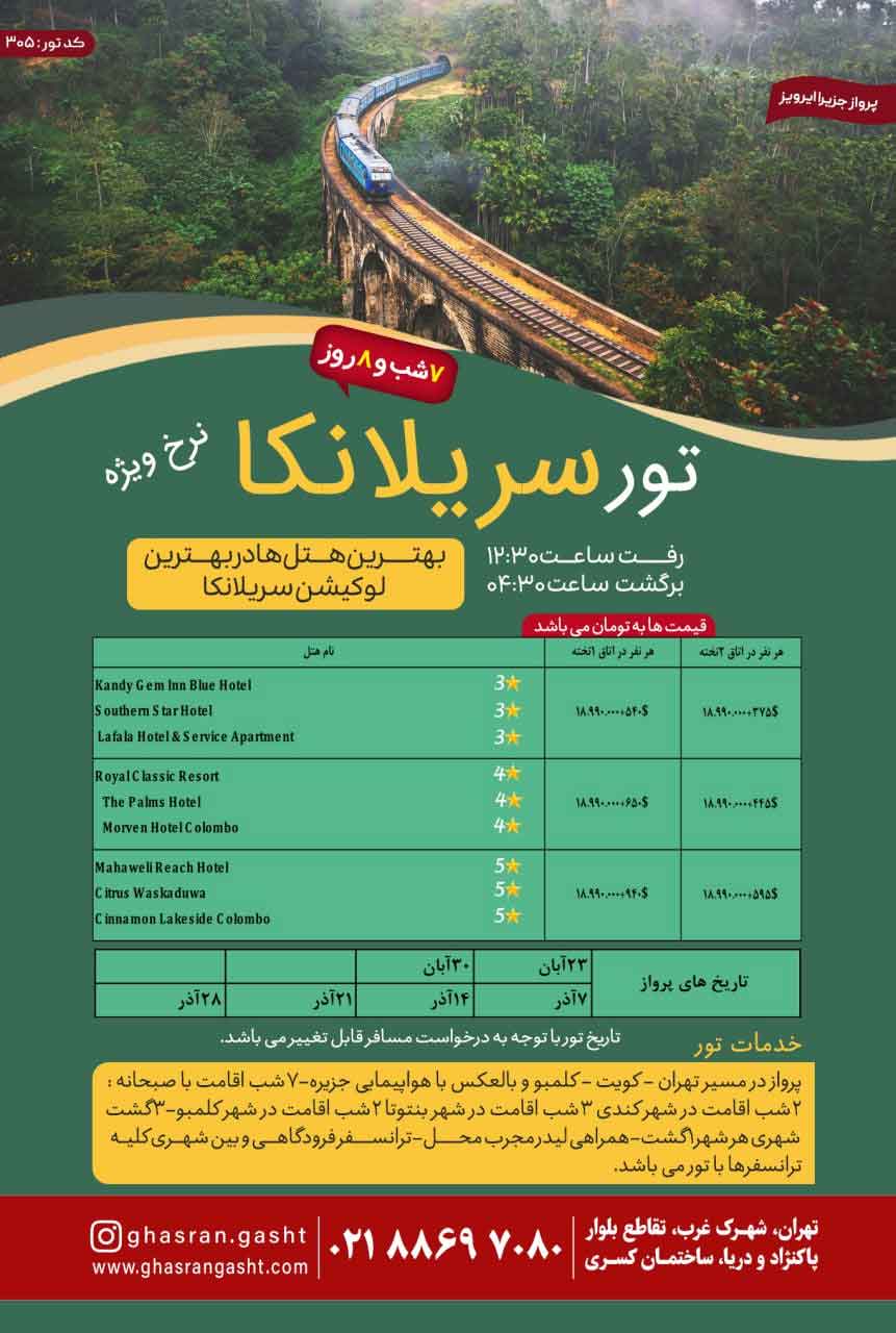 در حال حاضر به دلیل کمبود پرواز این مقصد و همچنین نوسانات ارزی نمی توان قیمت مشخصی را بیان کنیم و شما برای مشاهده لیست کاملی از قیمت پروازهای سریلانکا می توانید به این صفحه مراجعه کنید یا با کارشناسان ما در قصران گشت تماس حاصل فرمایید.