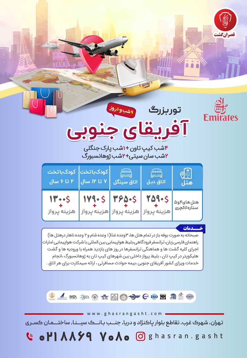 4شب کیپ تاون، 2 شب سان سیتی، 2 شب پارک جنگلی، 1 شب ژوهانسبورگ