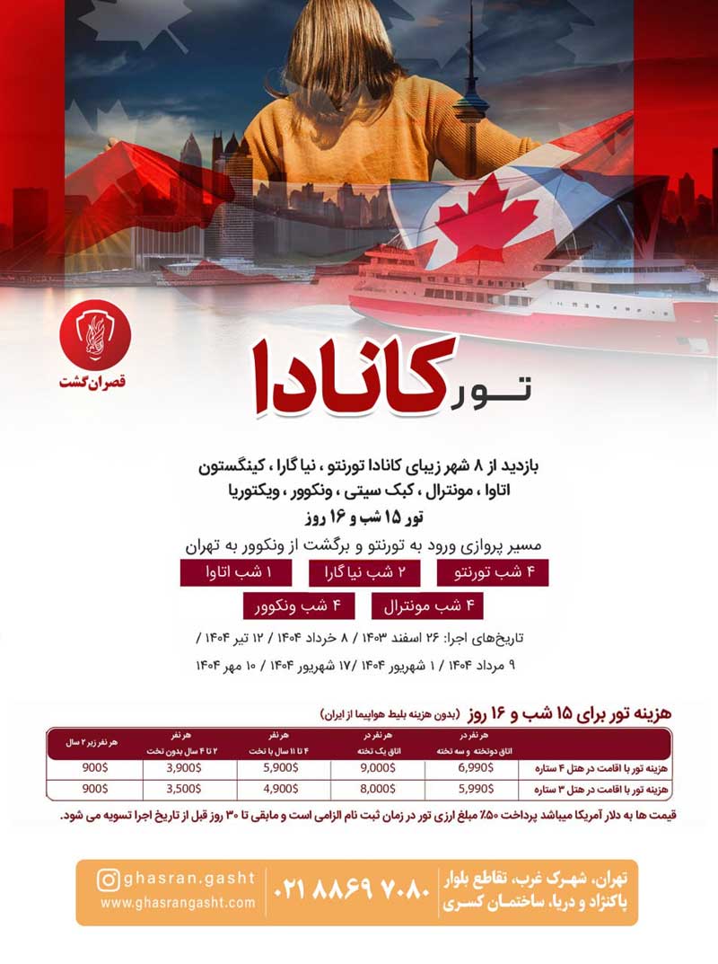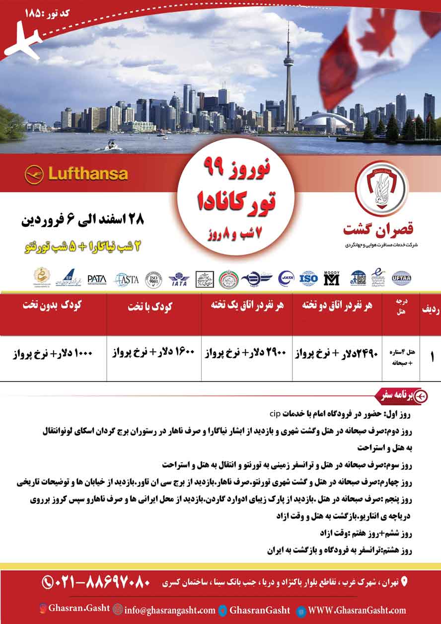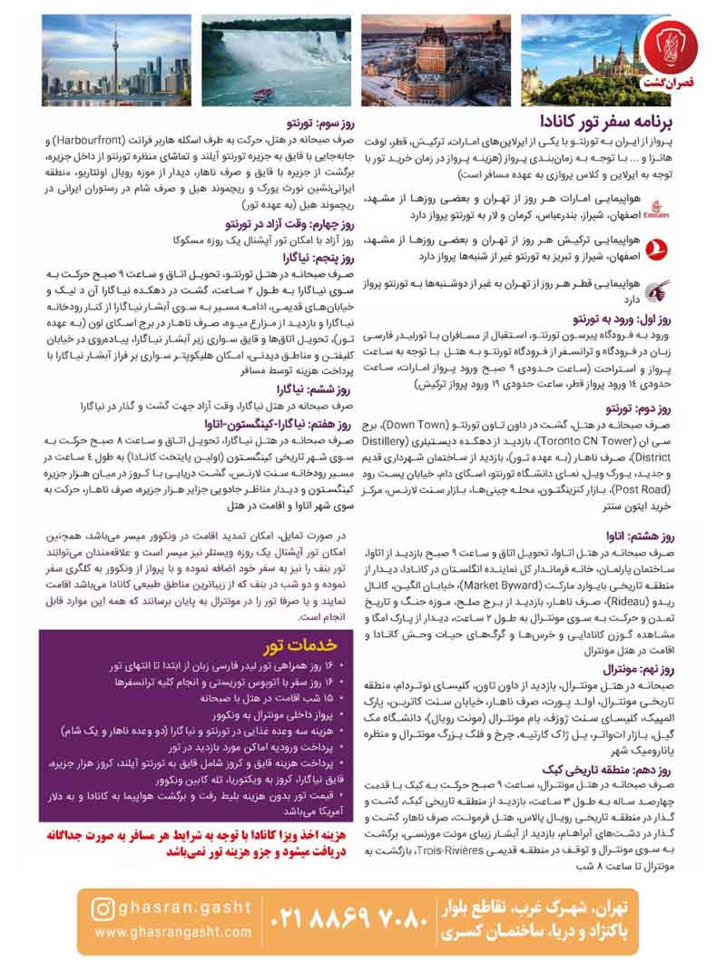 4 شب تورنتو، 2 شب نیاگارا، 1 شب اتاوا، 4 شب مونترال، 4 شب ونکوور