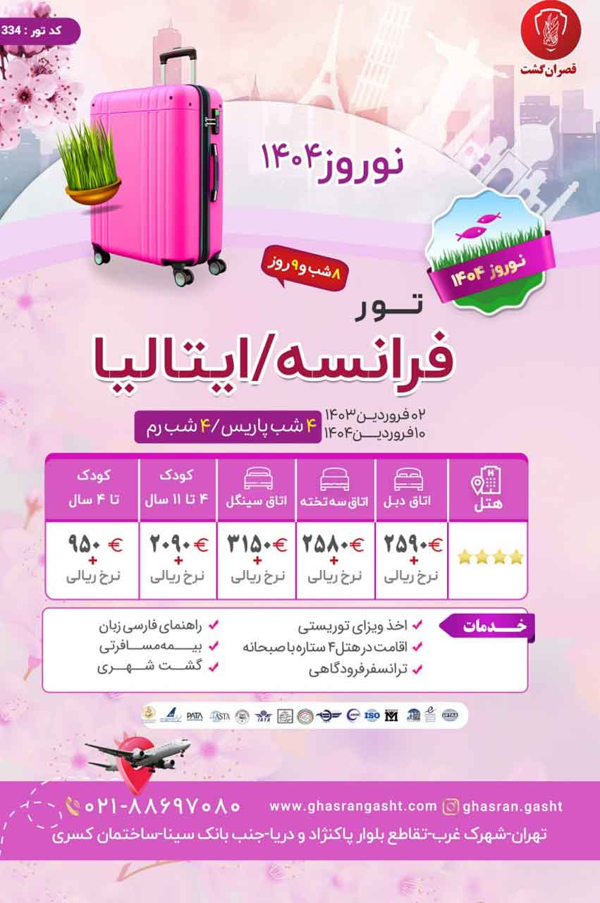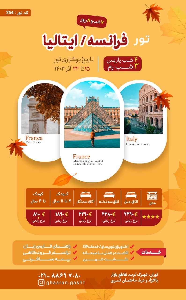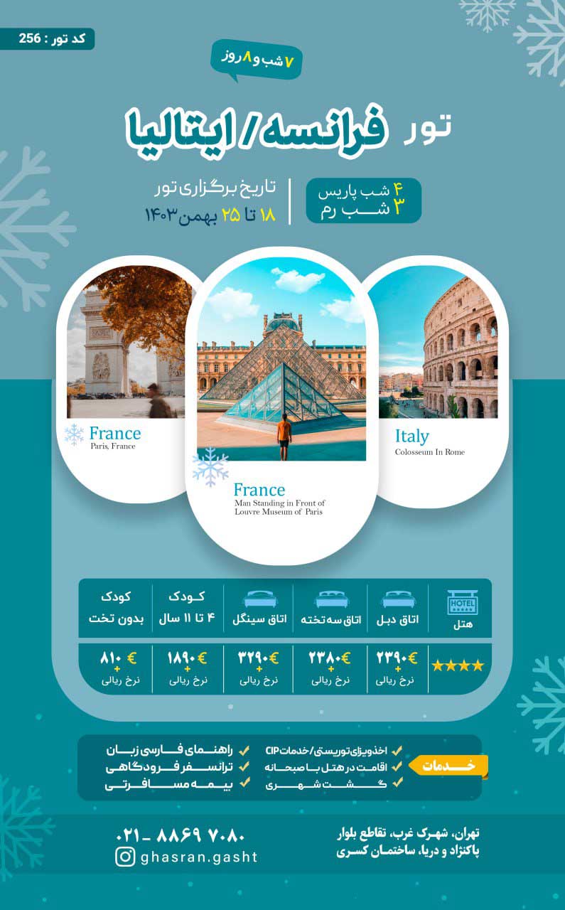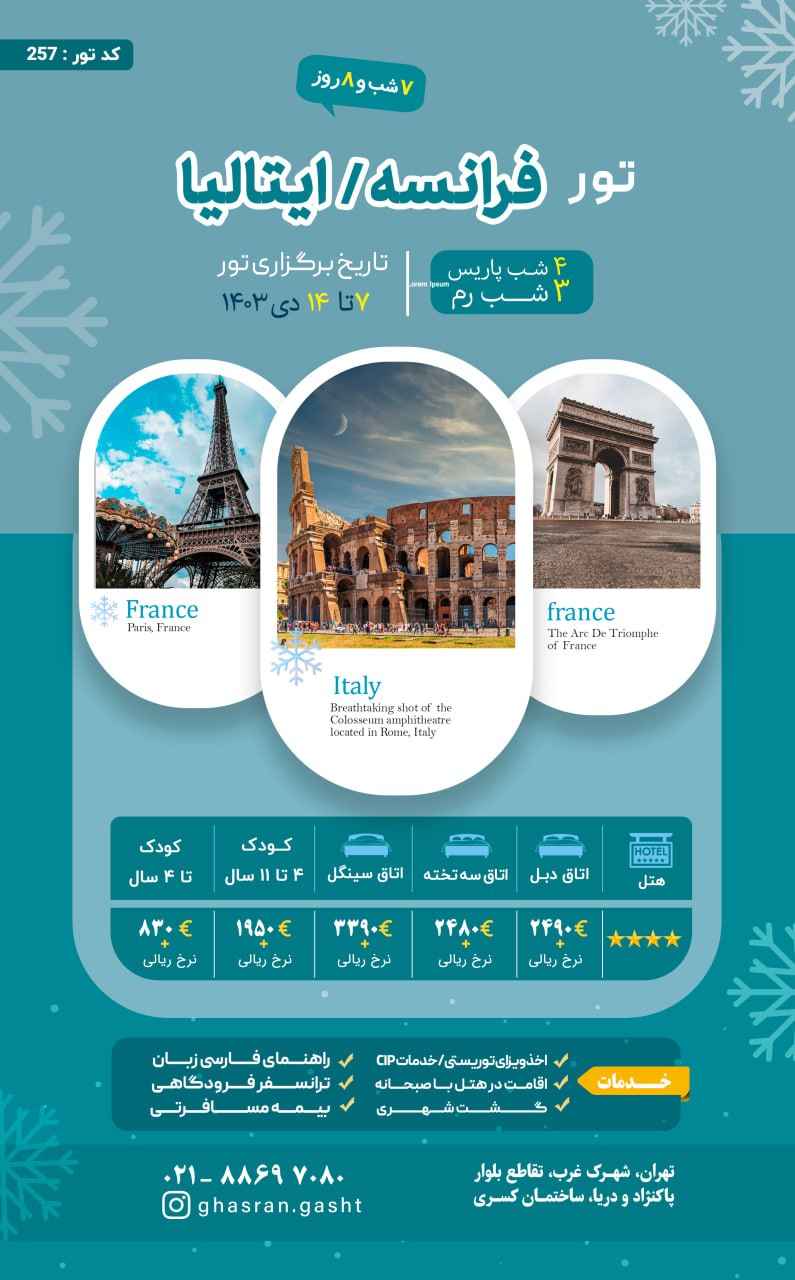 قیمت تور با رزرو اتاق سه تخته، 3180 یورو + نرخ پرواز می باشد. |
