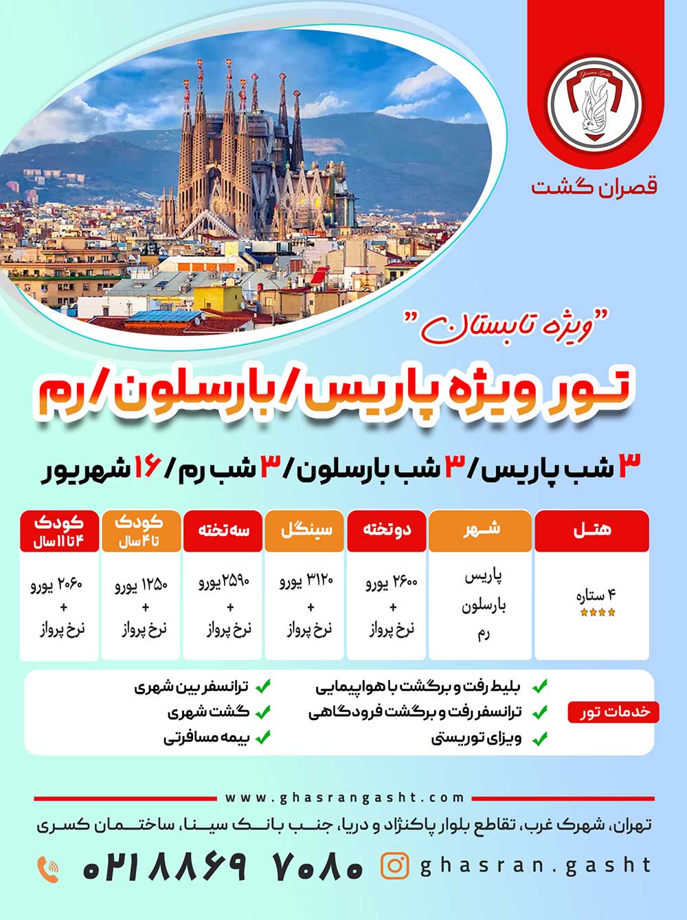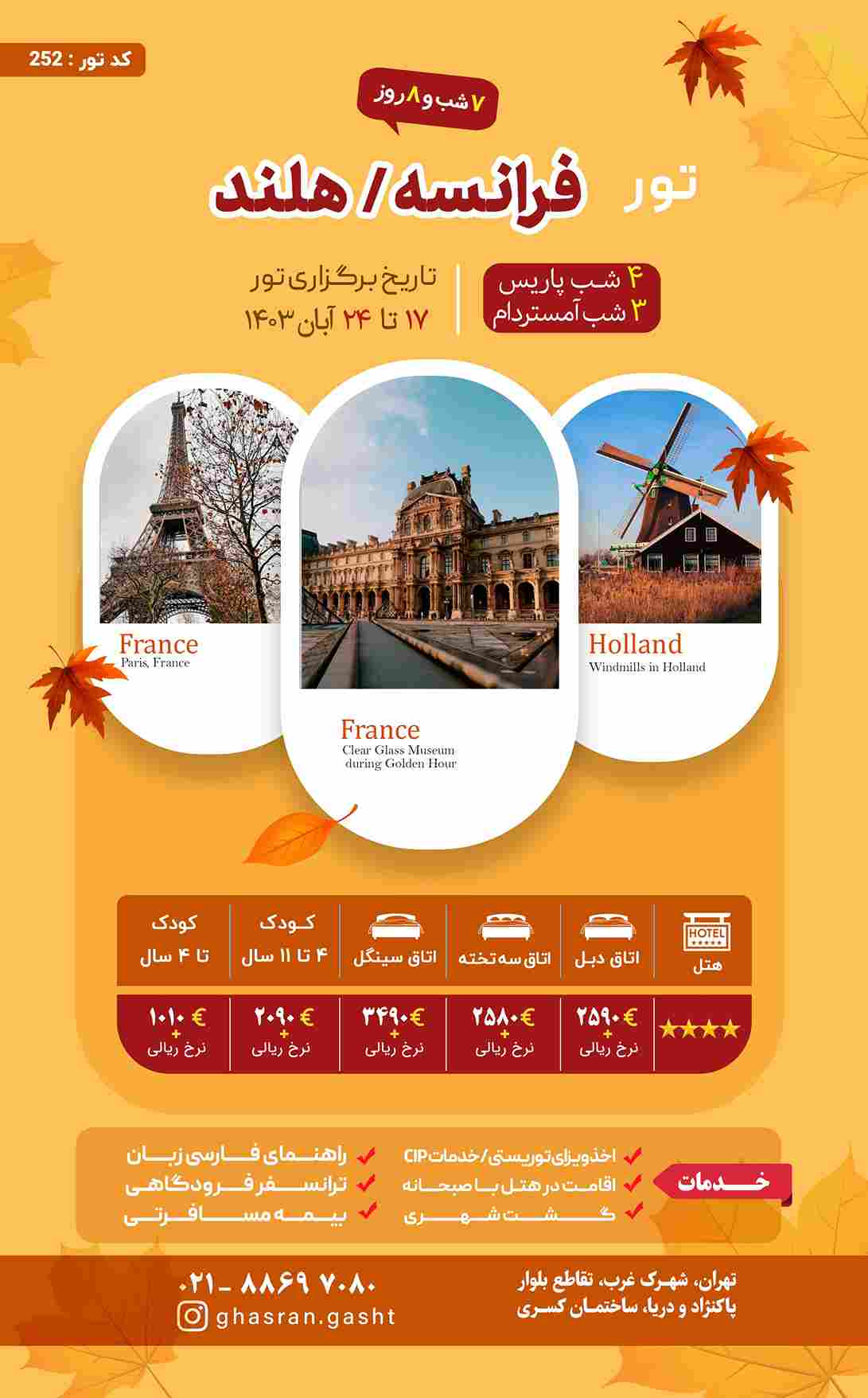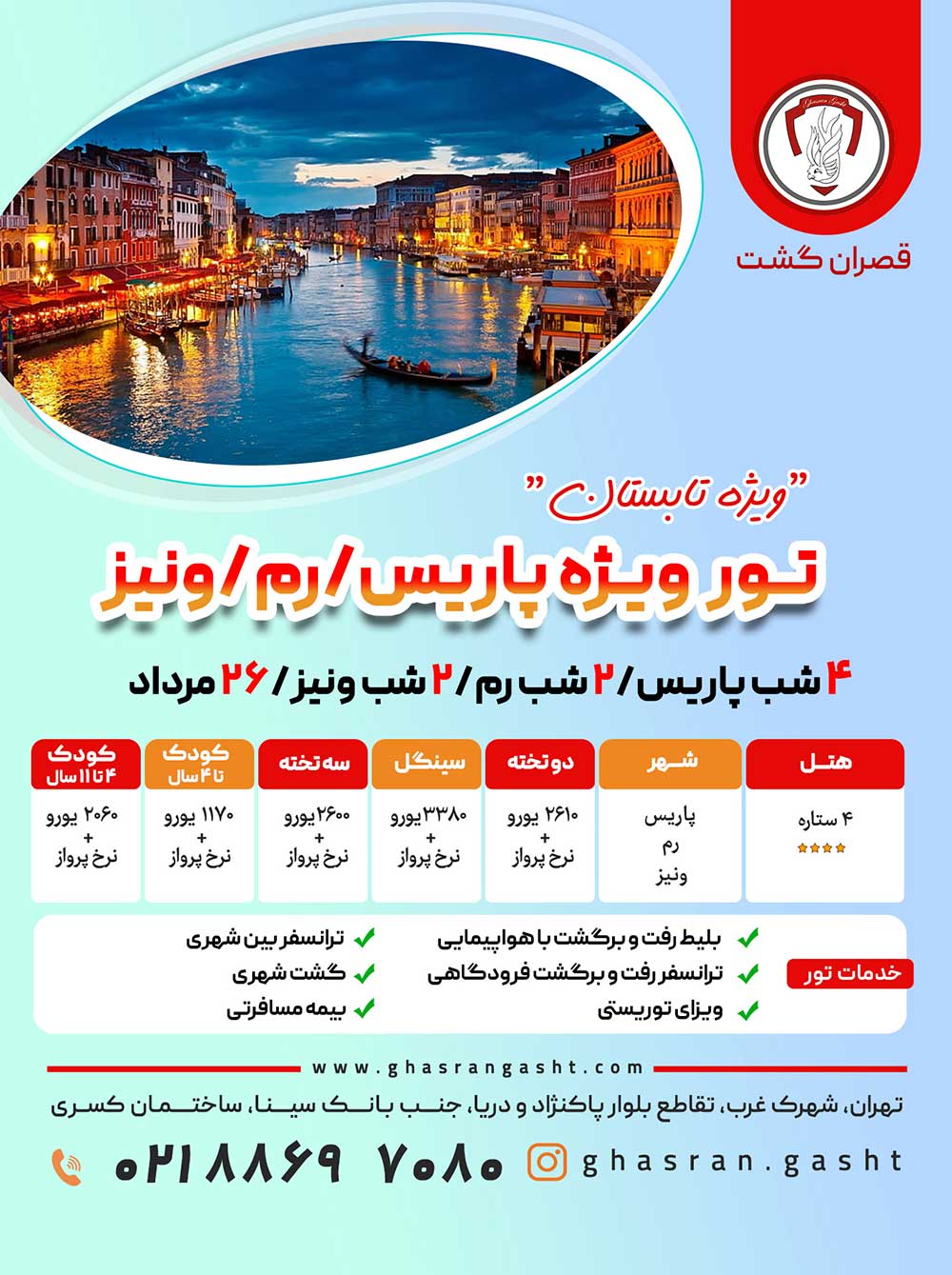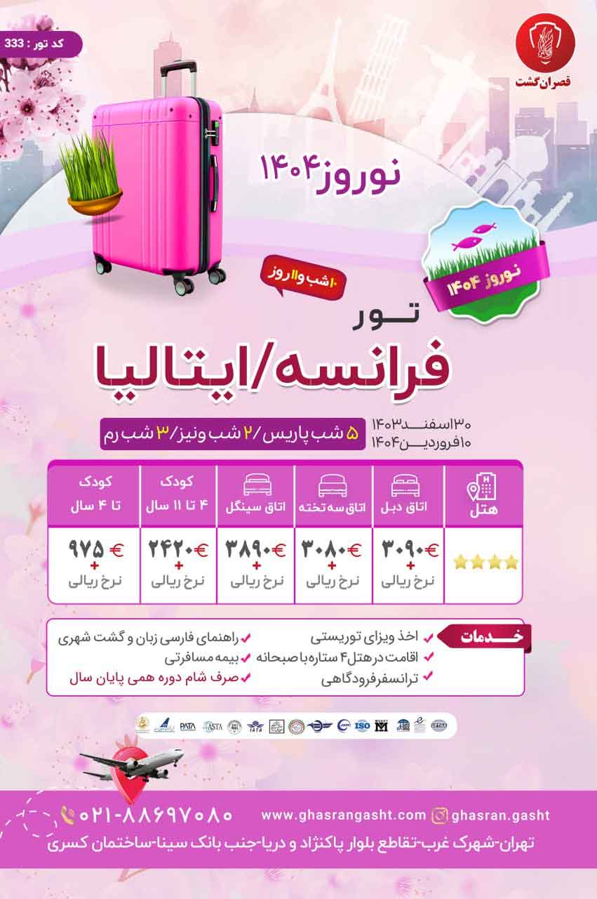 قیمت تور با رزرو اتاق سه تخته، 3180 یورو + نرخ پرواز می باشد. |