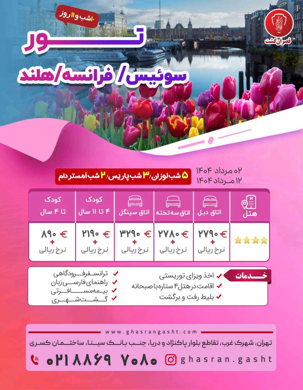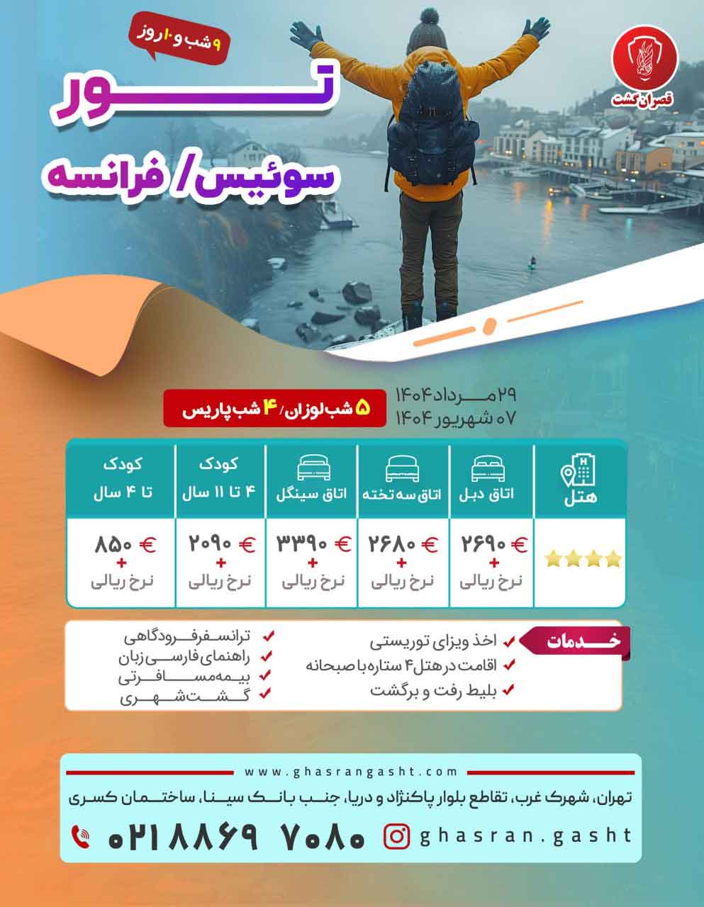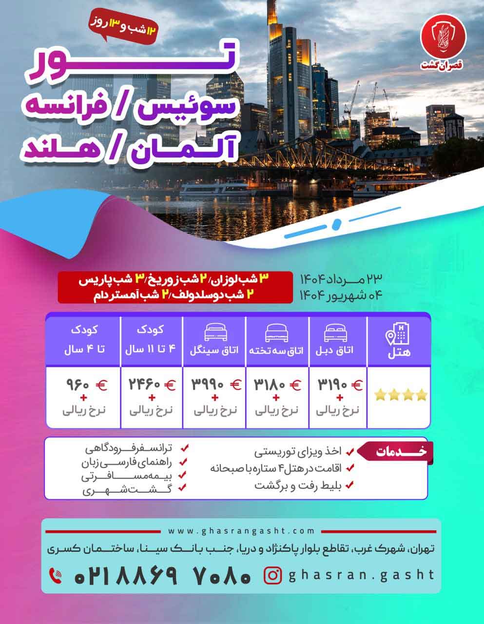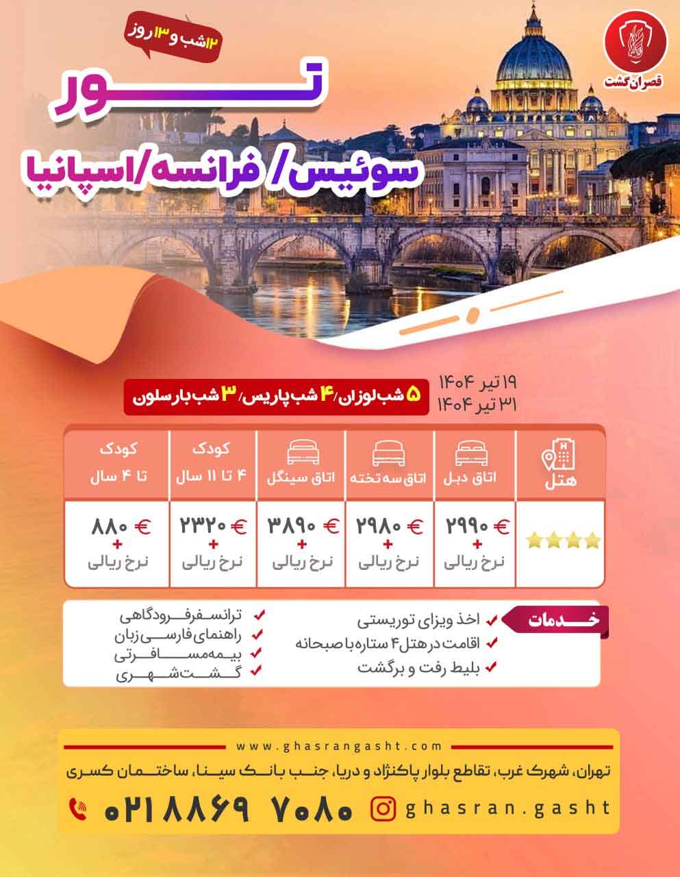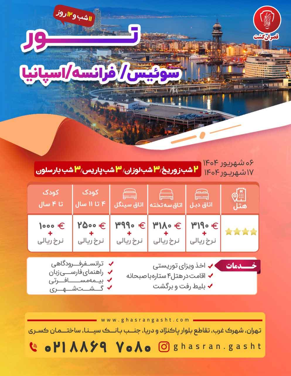 - گروهها: تور اروپا , تور پاریس , تورهای در حال اجرای قصران گشت , تورهای زمستان ,