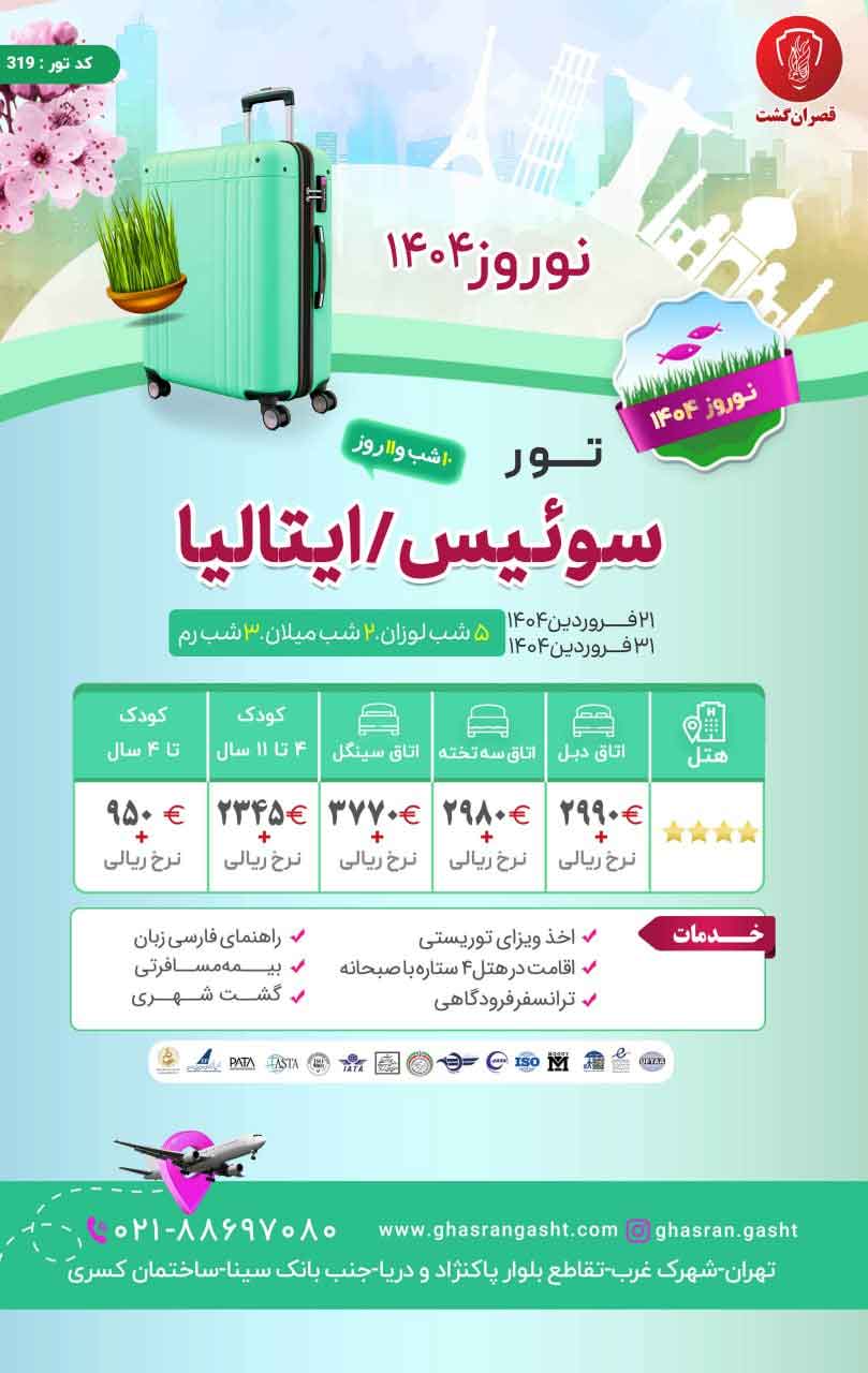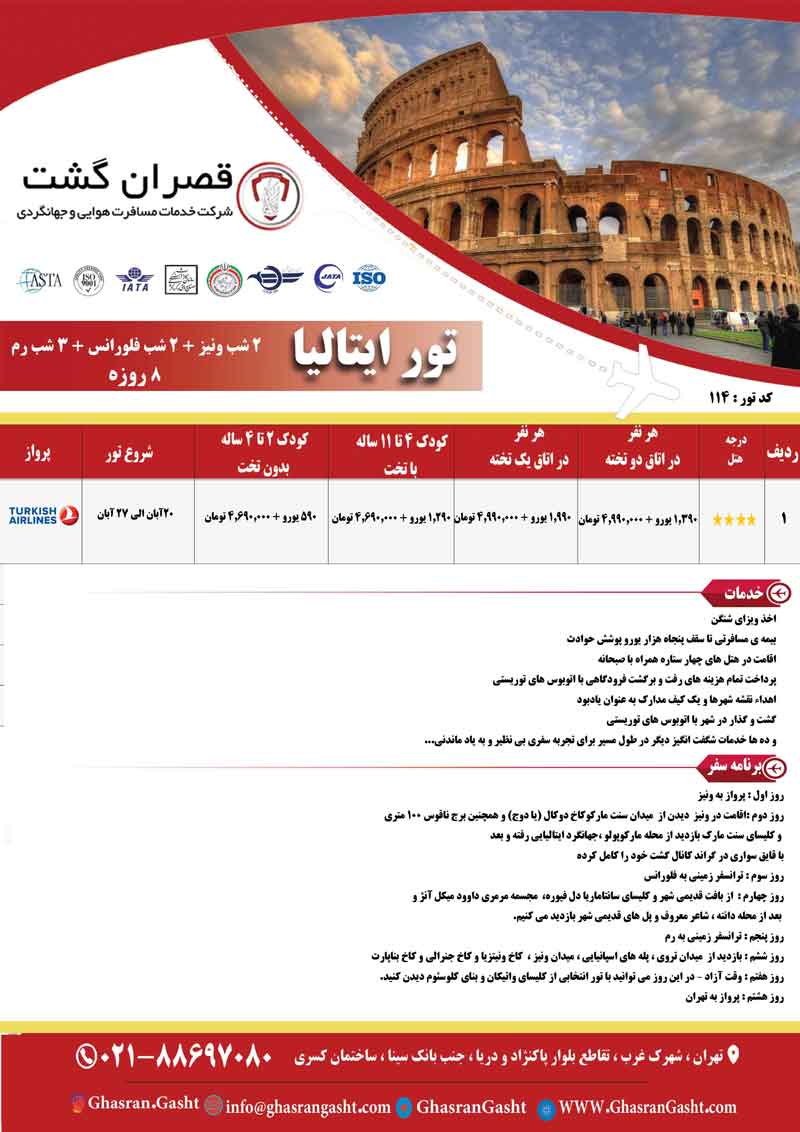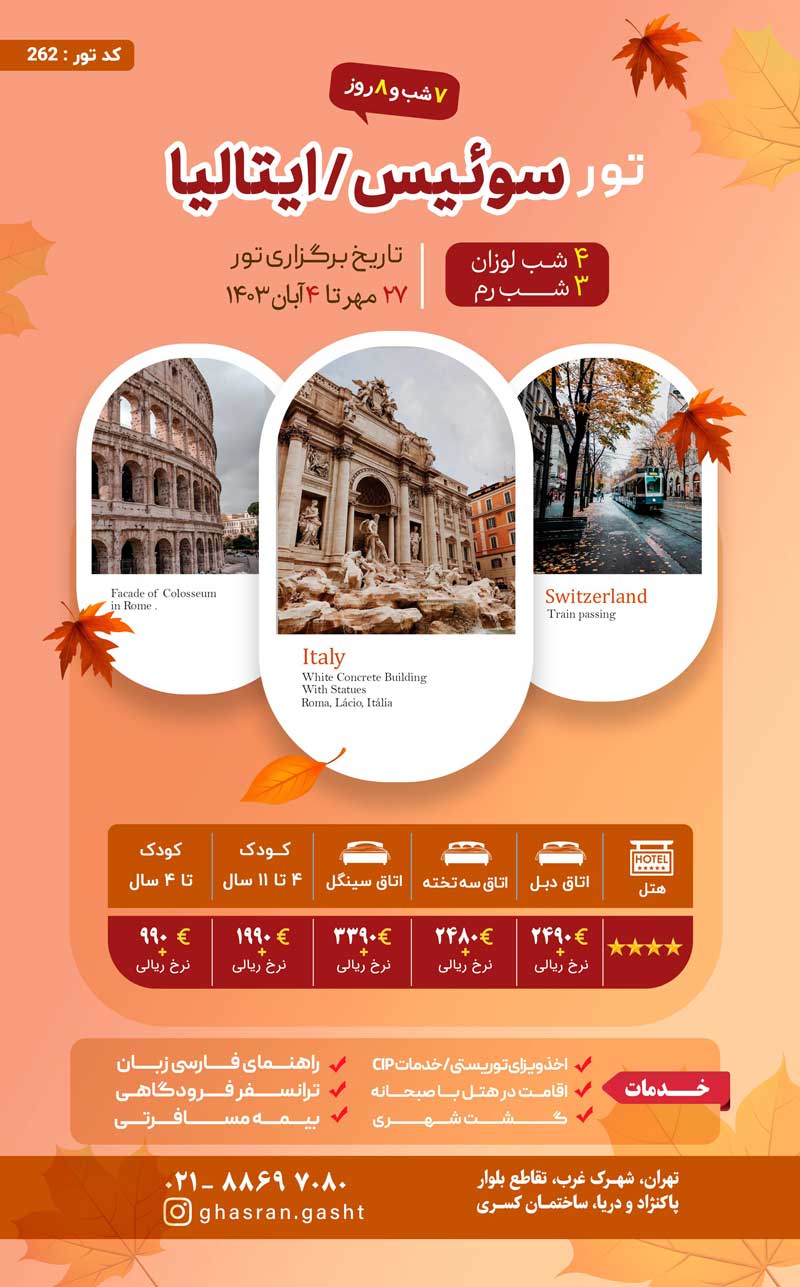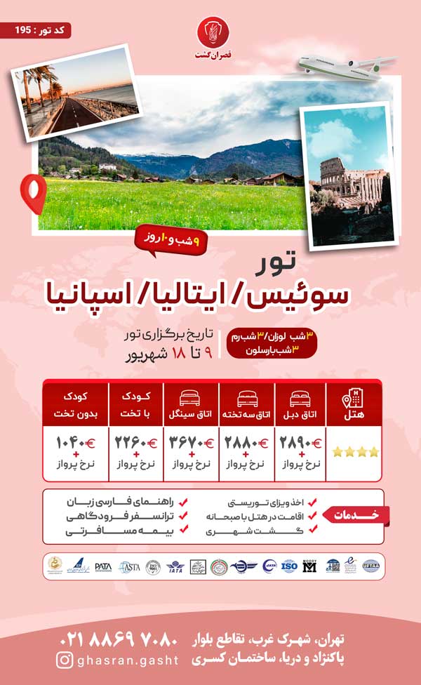 2490 یورو + نرخ ریالی | 3390 یورو + نرخ ریالی | 1950 یورو + نرخ ریالی | 830 یورو + نرخ ریالی | نرخ اتاق 3 تخته: 2480 یورو + نرخ ریالی |