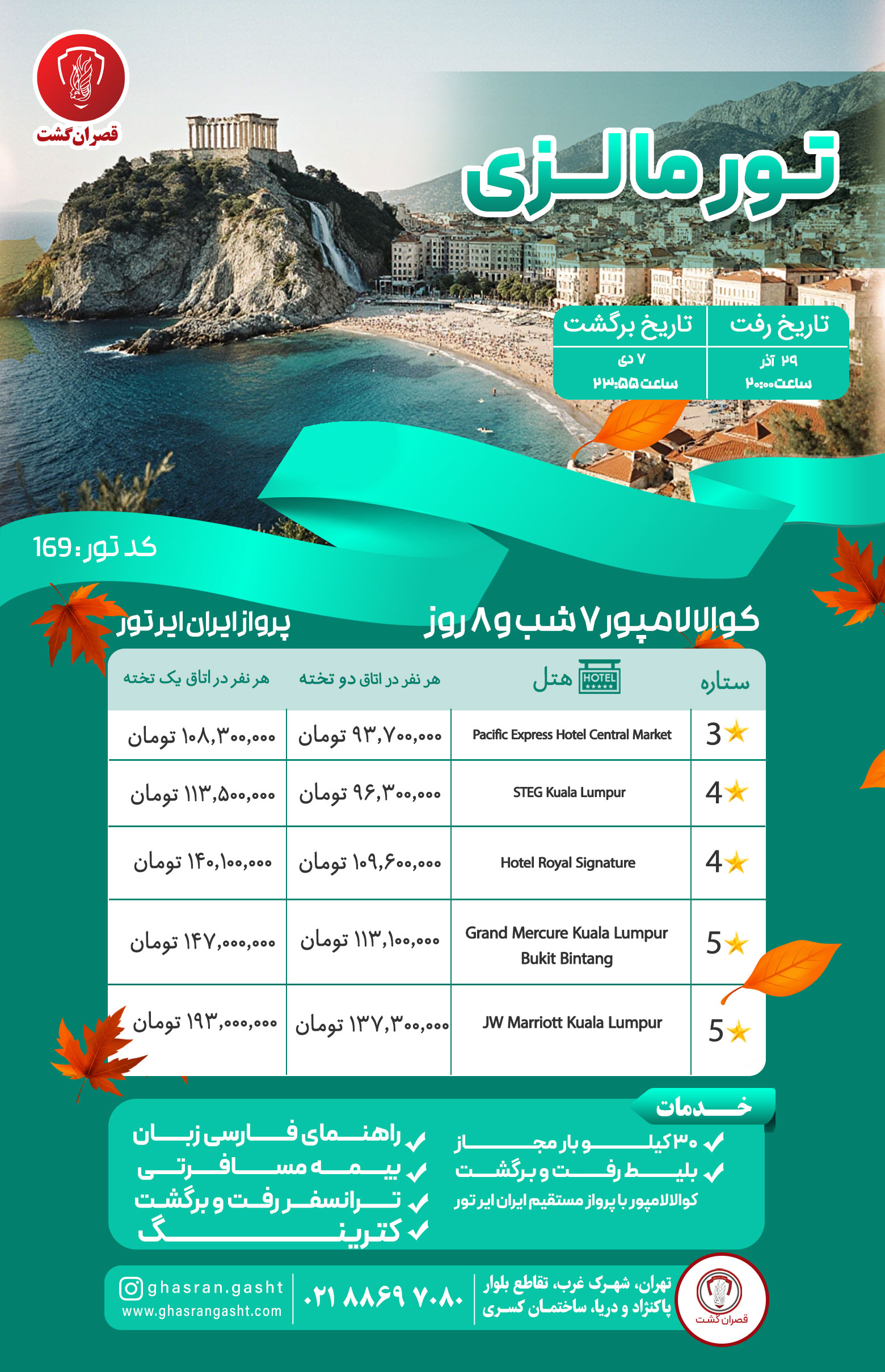 تور مالزی قصران گشت با پرواز مستقیم ایران‌ایرتور، یک انتخاب ایده‌آل برای سفری جذاب، مقرون‌به‌صرفه و کاملاً برنامه‌ریزی‌شده است. این سفر ۷ شب و ۸ روزه در شهر زیبای کوالالامپور برگزار می‌شود؛ شهری پر از مرکز خریدهای بزرگ، معماری مدرن، طبیعت گرمسیری و جاذبه‌هایی که آن را به یکی از محبوب‌ترین مقاصد آسیایی تبدیل کرده است.